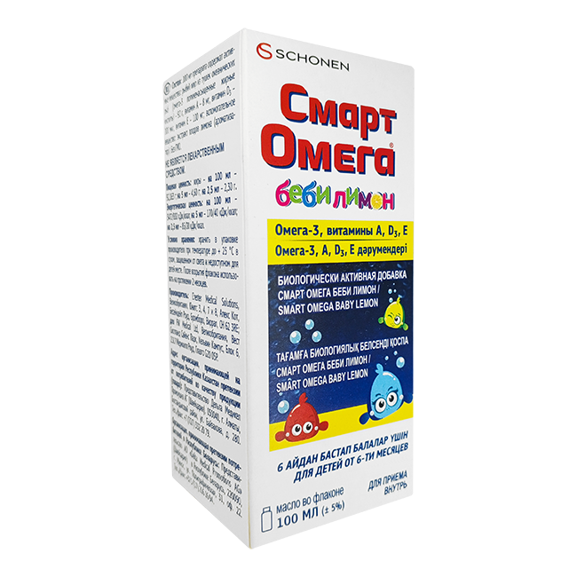 Смарт Омега Бэби может быть рекомендован как дополнительный источник незаменимых полиненасыщенных жирных кислот и жирорастворимых витаминов А, Dз и Е целью создания оптимальных диетологических условий функционирования когнитивной, нервной и костно-мышечной систем детей в период интенсивного роста и развития.