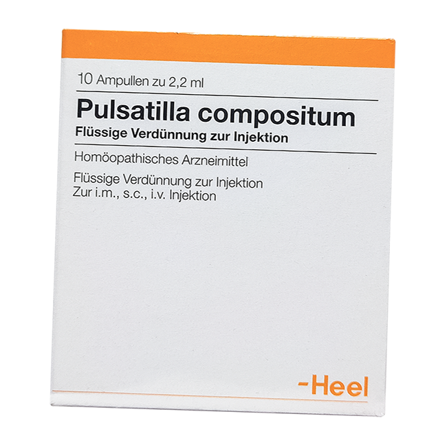 Гомеопатический раствор Пульсатилла композитум в ампулах по 2,2 мл для в/м введения. Ампулы фасуются в контурные пластиковые упаковки по 10 шт.