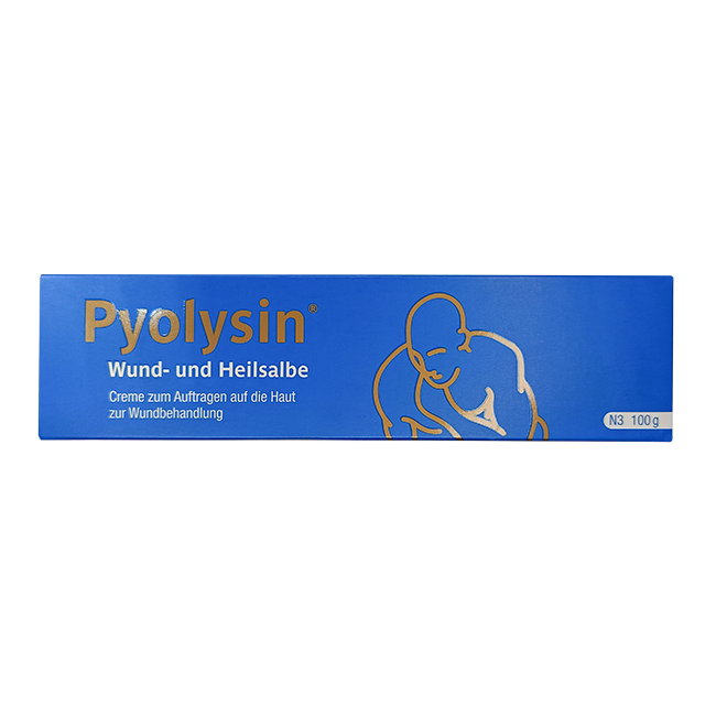 Пиолизин выпускается в виде мази в тубе объемом 100 г. Упаковка имеет яркий градиент синего цвета с белыми надписями, содержащими название препарата "Pyolysin" и указания на его применение. На упаковке также изображены синие фигурки, символизирующие защиту и заботу о коже. Туба упакована в картонную коробку бело-синего цвета с обозначением дозировки и объема.