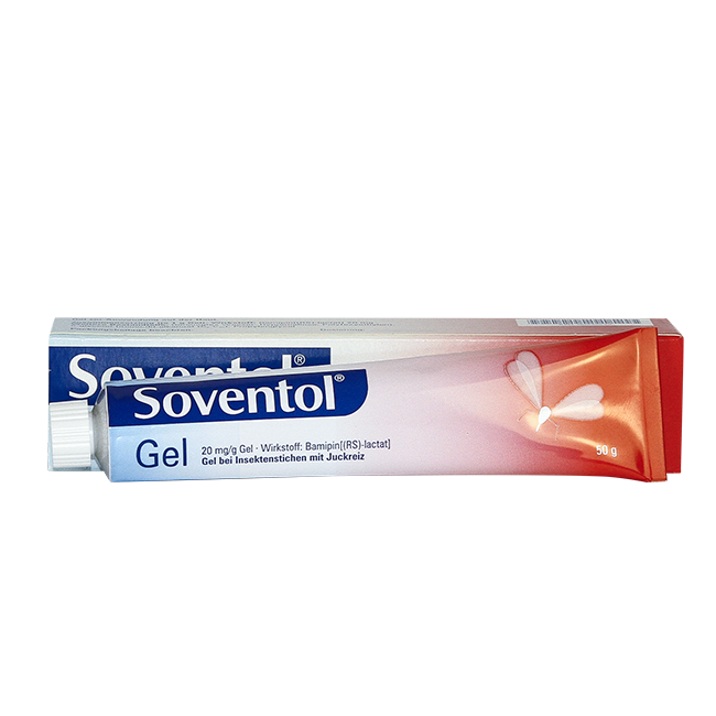 Soventol –противозудное и противоаллергическое средство для наружного применения, предназначенное для снижения неприятных ощущений при укусах насекомых, контактном дерматите и других состояниях, сопровождающихся зудом. Активным веществом препарата является бамипин, обладающий антигистаминной активностью.