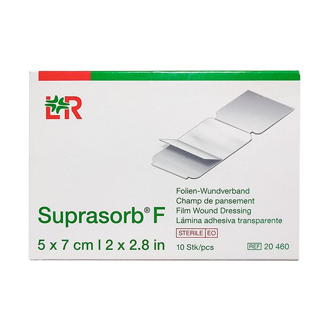 Пленочная повязка на раны Супрасорб F представляет собой гибкую клейкую повязку. Она состоит из полиуретановой пленки со слоем приятного для кожи полиакрилового клея, покрытого бумагой с силиконовой добавкой. Это бумажное покрытие имеет надрезы, облегчающие снятие повязки. Для удобного наложения повязки служит аппликатор (вспомогательная синтетическая пленка с рисунком).
