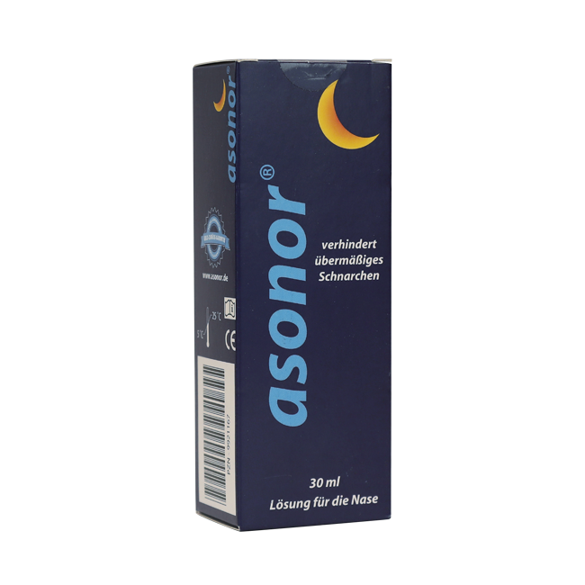 Asonor выпускается в виде раствора для носа во флаконе объемом 30 мл. Упаковка – картонная коробка темно-синего цвета с изображением полумесяца, что символизирует ночное применение. На упаковке размещена информация на немецком языке, включая название препарата и его назначение – «verhindert übermäßiges Schnarchen» (предотвращает чрезмерный храп).