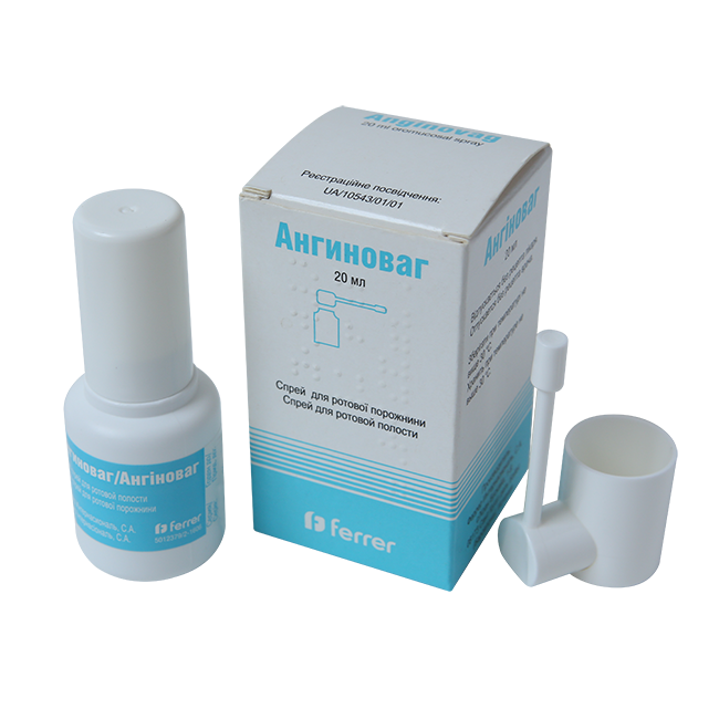 Ангиноваг —комбинированный спрей для местного применения, предназначенный для лечения воспалительных и инфекционных заболеваний полости рта и глотки. Благодаря многокомпонентному составу, препарат обеспечивает противовоспалительное, антисептическое, анальгезирующее и противоотечное действие.